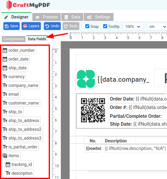 When you drag and drop a field from Data Fields, components are automatically created with basic expressions tailored to your JSON data types that based on the JSON data the Data tab.
