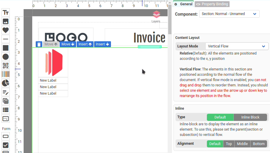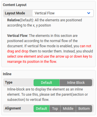 All the elements in a Vertical Flow section are by default arrange(or flow) vertically. To arrange the elements horizontally, we have to set the Inline Type of the elements to Inline Block.