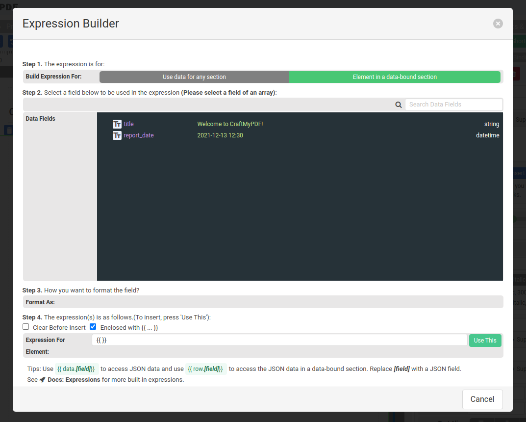 Click on Insert Data Expression to launch Expression Builder. Follow the steps to build an expression